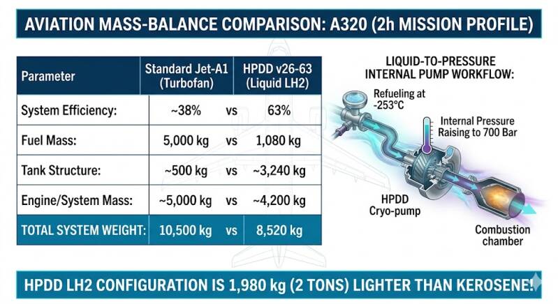 The HPDD v26-63 operates at 63% Brake Thermal Efficiency, requiring significantly less fuel volume than any traditional turbine. This efficiency allows for smaller LH_2 storage, resulting in a total system that is 1,980 kg lighter than a kerosene-powered aircraft.